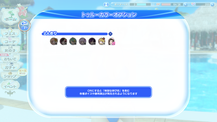 いずれかを入手することで、対象の女の子の「2人きり」オプションの切り替えが可能になります。