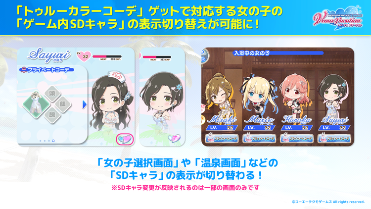 トゥルーカラーコーデを入手することで、「女の子選択画面」や「温泉画面」などで表示される