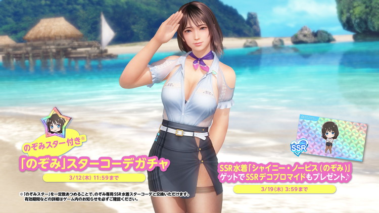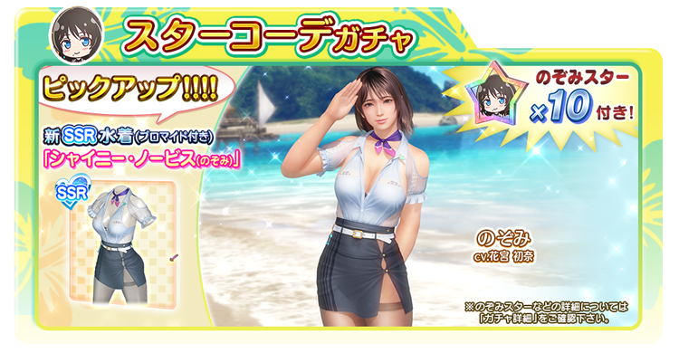 「スターコーデガチャ」ではSSR水着「シャイニー・ノービス(のぞみ)」がピックアップされています。