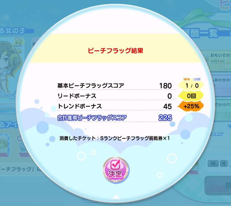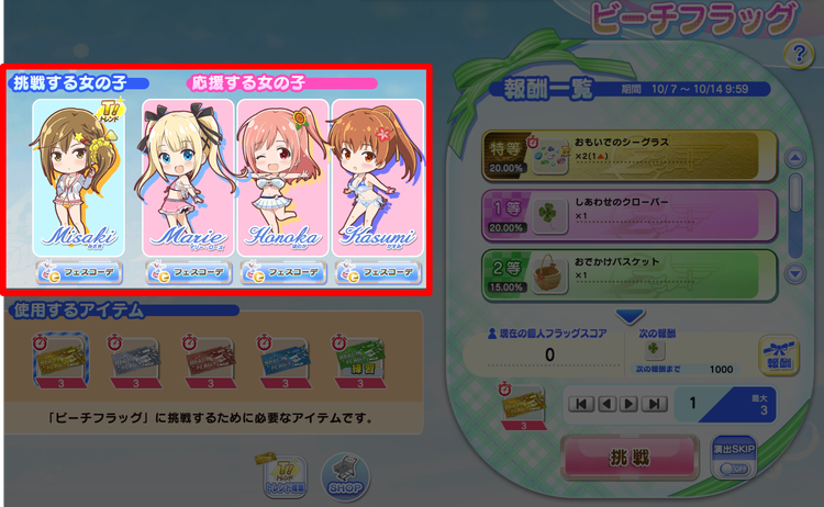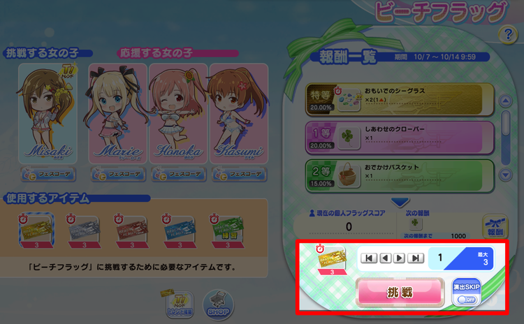※「練習用ビーチフラッグ挑戦券」でビーチフラッグに挑戦しても、ビーチフラッグスコアは獲得できません。