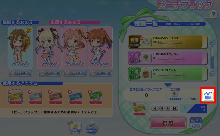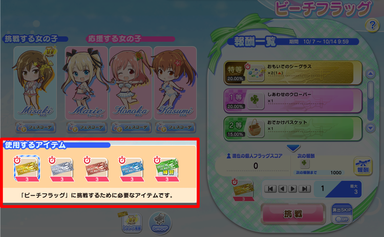 ビーチフラッグに挑戦することで、報酬一覧に表示されているアイテムの中から