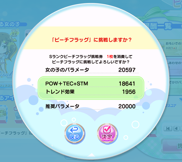 ※挑戦する女の子のパラメータが推奨パラメータに近いほど、勝ちやすくなります。