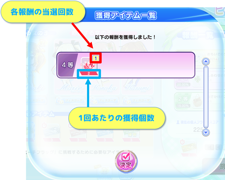 また、獲得アイテム一覧では各報酬の当選回数や、