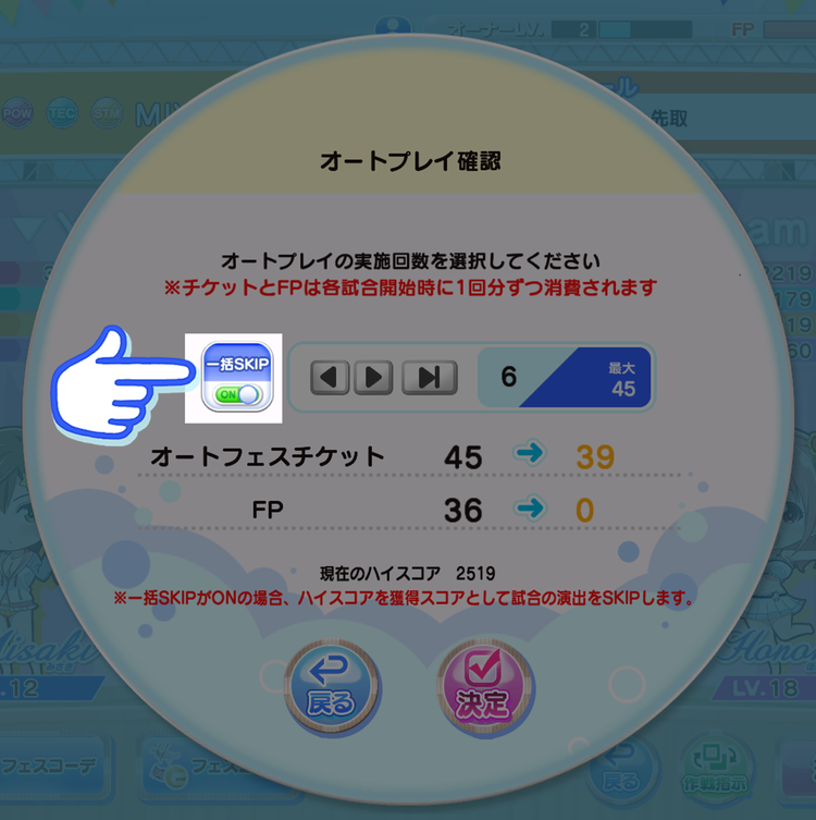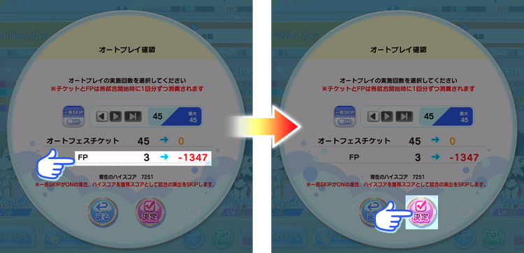 ※「一括SKIP」ボタン「ON」「OFF」どちらの場合も、「オートフェスチケット」は2枚以上でしか使用できません。