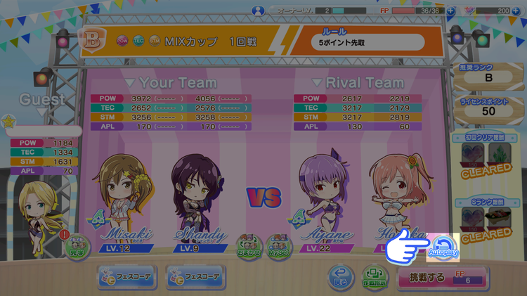 ※挑戦するフェスをSランク評価でクリアしていない場合、「Autoplay」ボタンは選択できません。