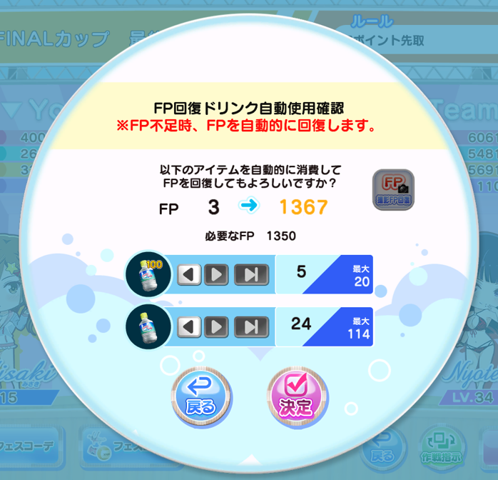 この画面で選択した分だけ「FP回復ドリンク」「FP回復ドリンク100」が自動で使用されます。