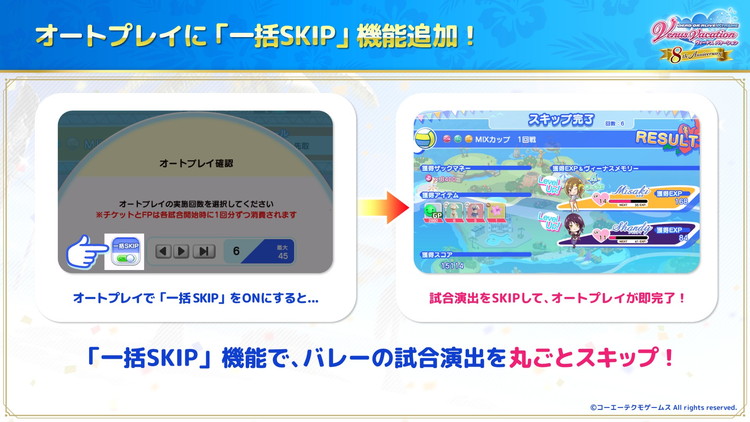 バレーの試合演出をスキップしてくれる「一括SKIP機能」を追加しました!