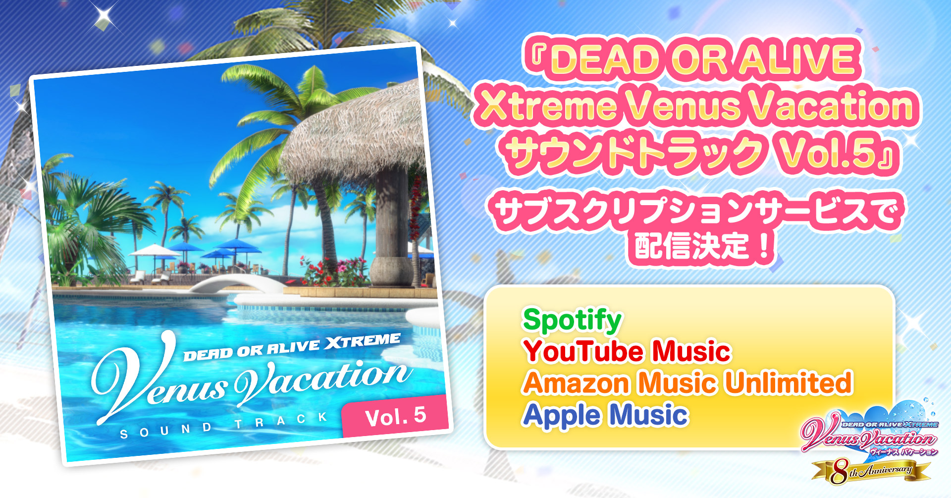 各種サブスクリプションサービスで好評配信中の「DEAD OR ALIVE Xtreme Venus Vacation サウンドトラック」について、『DOAXVV』8周年を記念して『Vol.5』の配信が決定しました!ご自宅や外出先など、日常生活でもぜひバカンスをお楽しみください。