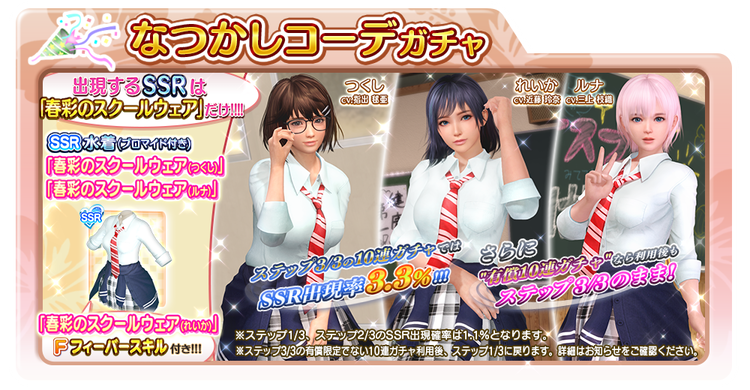 「春彩のスクールウェア(つくし)」は、「SSR水着確定チケットガチャ」「ヴィーナスガチャ」