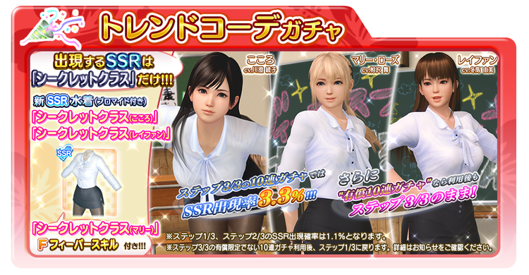 SSR水着「シークレットクラス(マリー)」「シークレットクラス(こころ)」「シークレットクラス(レイファン)」や、