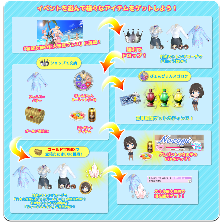 ※メインサポーターまたはサブサポーターの女の子が対象のトレンドSSR水着をフェスコーデに装備して