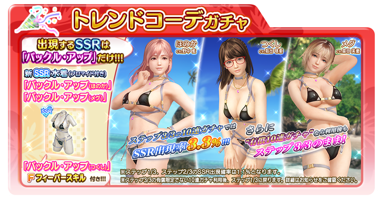 SSR水着「バックル・アップ(つくし)」「バックル・アップ(ほのか)」「バックル・アップ(メグ)」や、