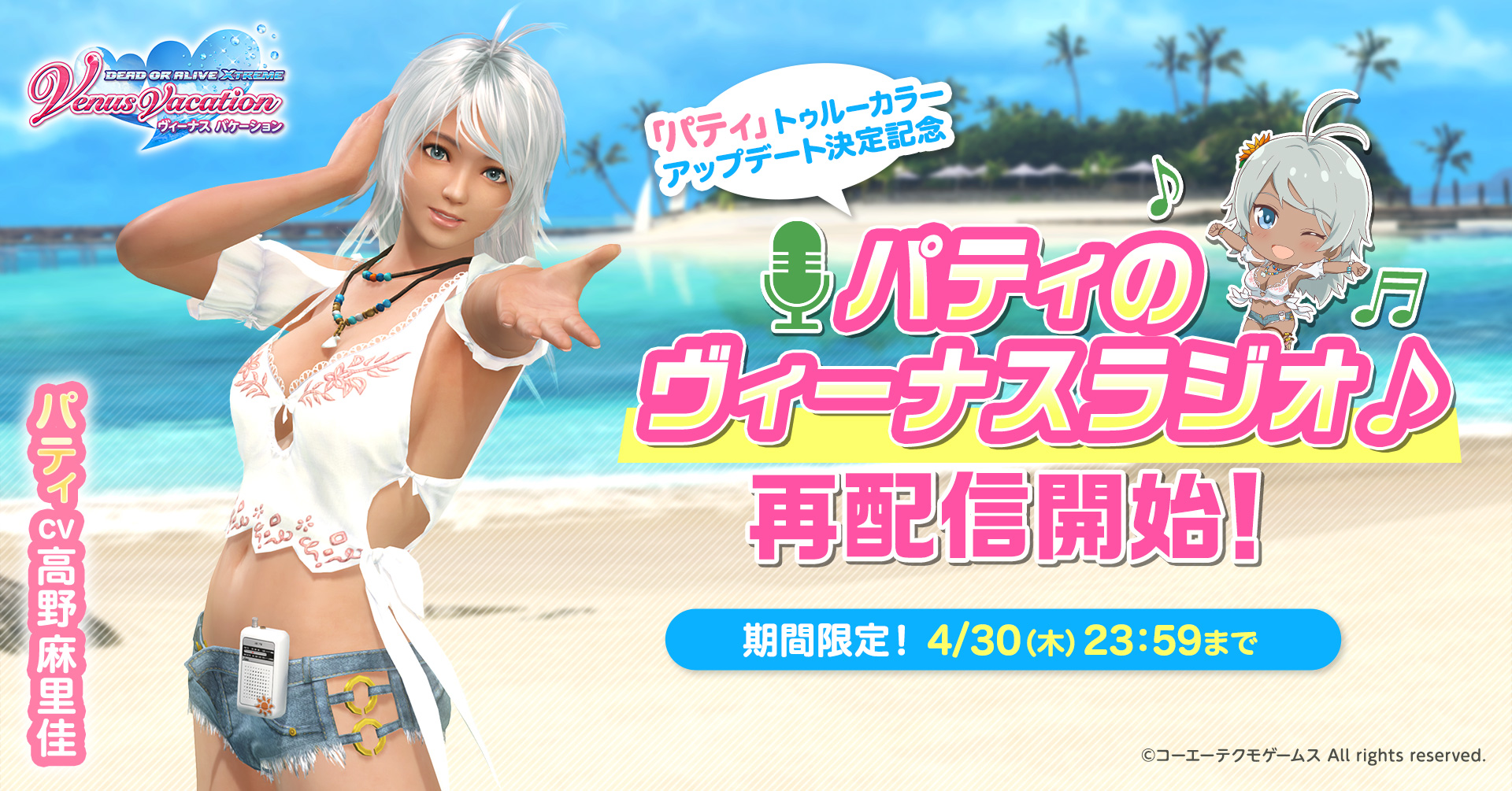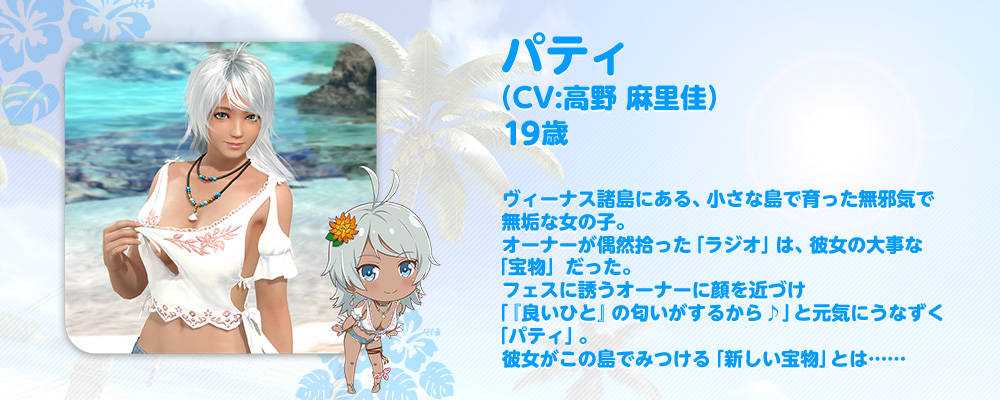 ラジオ好きな「パティ」(CV: 高野 麻里佳)がラジオDJとして『DOAXVV』の楽曲をご紹介しながら、